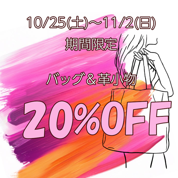 10/25(土)~11/2(日)期間限定 バッグ&革小物20%OFFイベント開催中♪ 2025-10-24 最終更新日時 : 2025-10-24 a mitteco 当店では10/25(土)~11/2(日)の期間限定 バッグ&革小物が20%OFFイベント開催中です♪ 気になっていたバッグやお財布をこの機に新調してみませんか? ぜひ、チェックして見てくださいね☆彡 オンラインショップへはこちら(~2025/11/2まで公開中) FacebookXBluesky